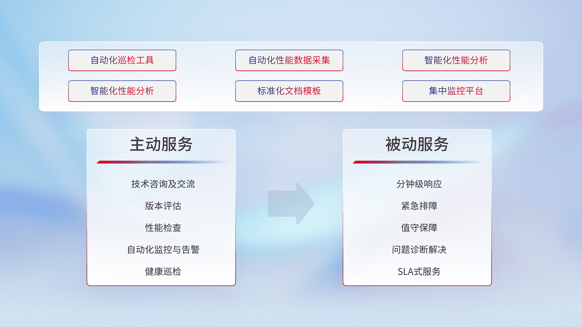 智能化工具和标准化文档,,保障服务质量,,,,提供主动服务(包含技术咨询、、、版本评估、、性能检查、、、、自动化监控与告警、、健康巡检)和被动服务包含(分钟级响应、、、、紧急排障、、、、值守保障、、问题诊断解决、、、SLA服务)。。。